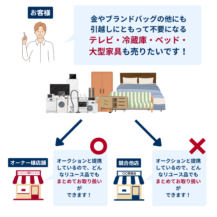 当初は顧客様のみの買取を自社で行っていましたが、買取依頼品も増えてきたため加盟に乗り切りました。