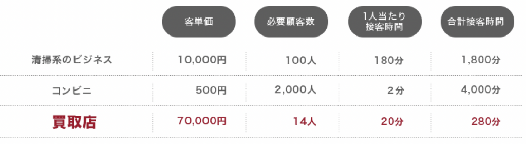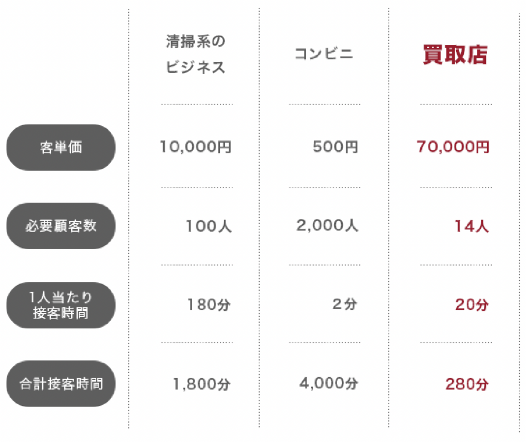 買取業界は客単価が高い上に、接客時間も1人当たり30分程度と比較的少ない。
