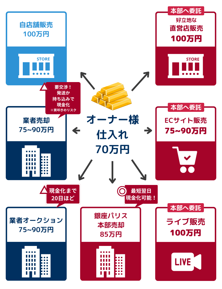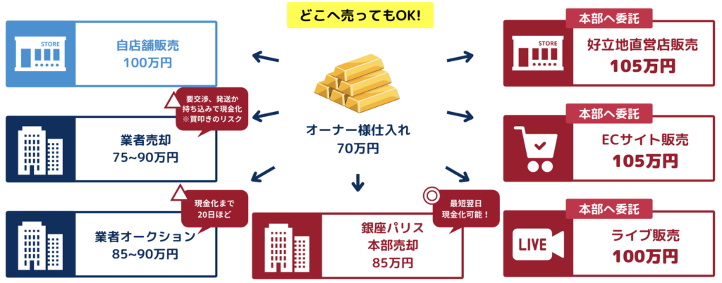 他社の販路は基本的に一般消費者ではなく、自社オークションや業者間オークションといった業者相手に売っているので中間マージンを考慮した低めの金額での取引となりますが、銀座パリスはその分をご自身の利益に結びつけることができます。