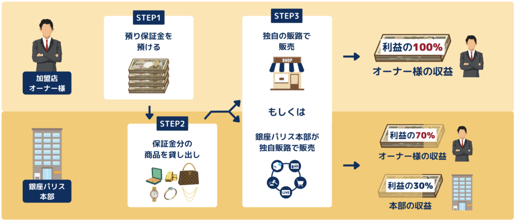 販売プランの収益でロイヤリティ、テナント代を支払いできていることから、他買取店よりだいぶ有利な状況で買取価格が提示できる事です。